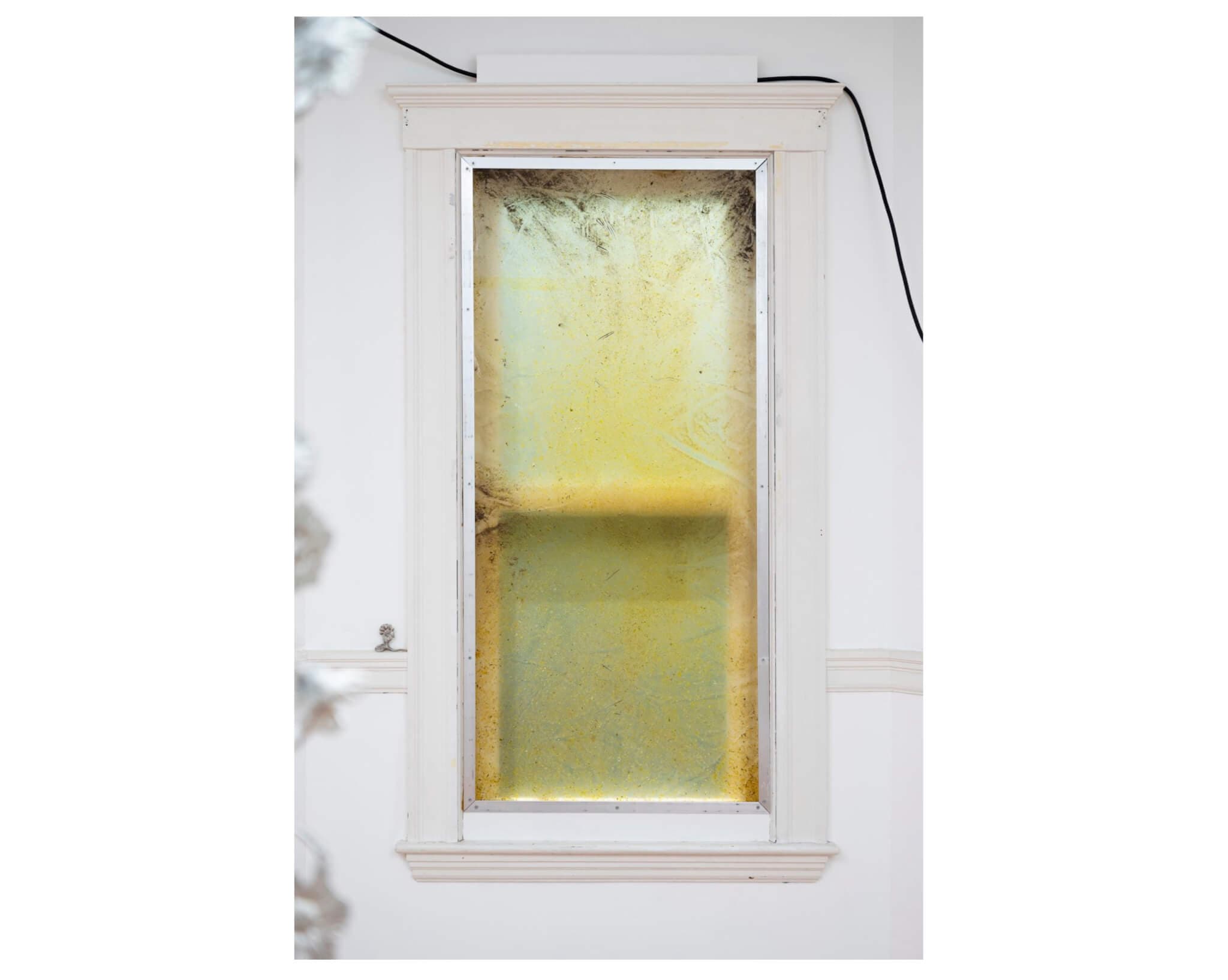 That’s when I learned that all of the work is made from flowers. Covering the two windows in the space, Kantardžić’s echo 2 (orpheus, shadow) (2025) are translucent bioplastic films made from pulverized daffodils and soil, with a very pungent, grassy scent. Another work by Kantardžić, echo in memoriam (2023), is a series of spotlights with yellow-tinted gels, dyed using an alcohol ink made from daffodil petals. These pieces filter all the light in the space with a subtle yellow tinge, completely shaping the experience and producing a mellow-yellow effect that I found irresistible, like a fly drawn to a lightbulb. Both pieces stem from Kantardžić’s larger, ongoing echo series, begun in 2022 when they planted daffodils in a field in the shape of the word “DROWN.” This gesture is partly inspired by Ovid’s story of Echo and Narcissus (the genus name for daffodil), in which Narcissus, a mortal cursed with excessive vanity, transforms into a daffodil after dying by a pool bearing his own reflection. It’s a tragic, cautionary tale of the dual nature of beauty, its ability to arouse both ecstasy and agony.