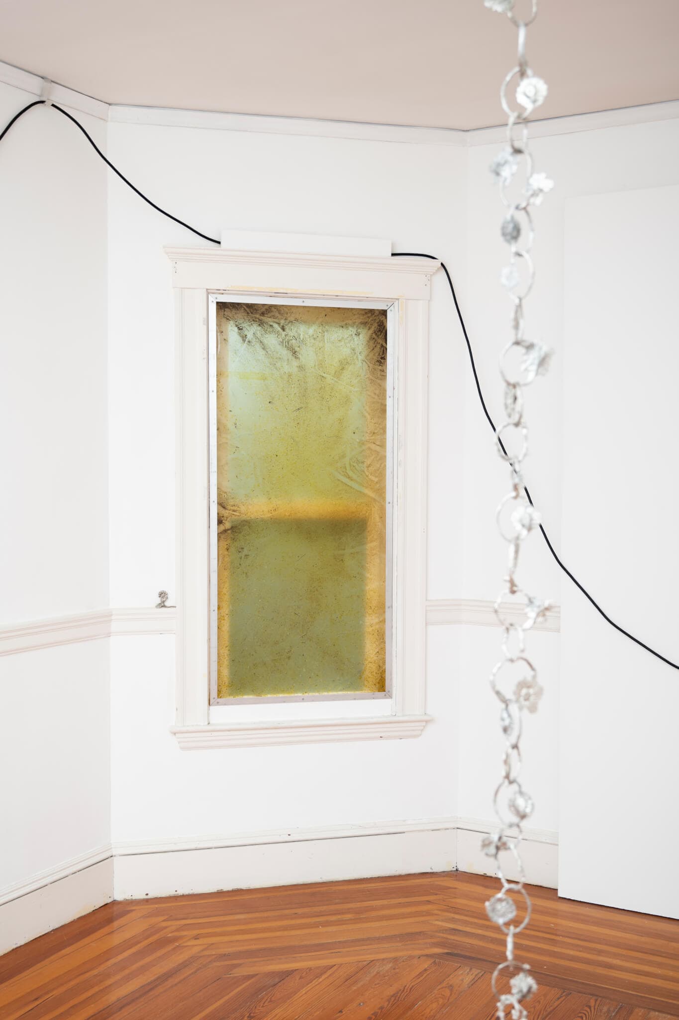 Turning to one of the nooks in the room, I notice a fresh flower emerging from a pipe embedded in the wall. This piece by Wong—an auxiliary “Easter egg” resulting from the artists’ conversations while preparing the show—is inspired by Bernie Boston’s Flower Power photograph, which depicts a peaceful protester at the 1967 March on the Pentagon placing flowers in the barrels of soldiers’ rifles. In this current moment of intensifying resistance and protest, this gesture feels particularly beautiful and resonant.