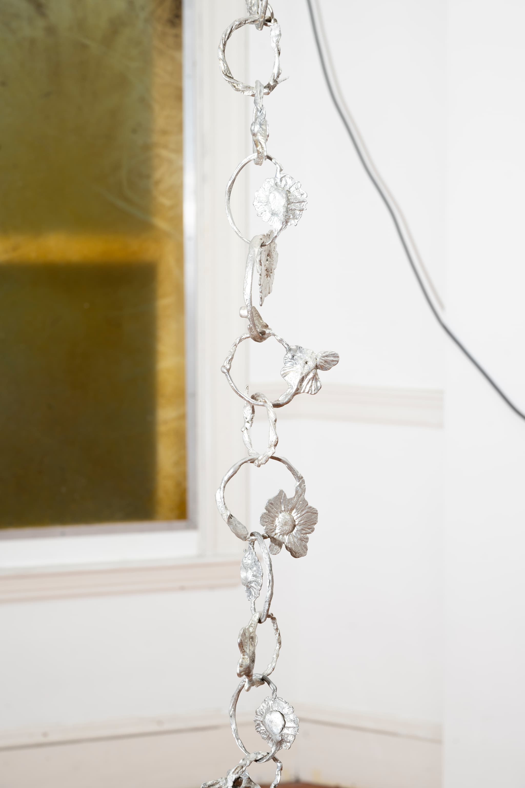 Maggie Wong, Grounding Cord, detail, 2025. Cast and soldered pewter. 3.5 in. x 3.5 in. x 9 ft., dimensions variable with installation of single casts or small links. Photo courtesy of deiner gallery.