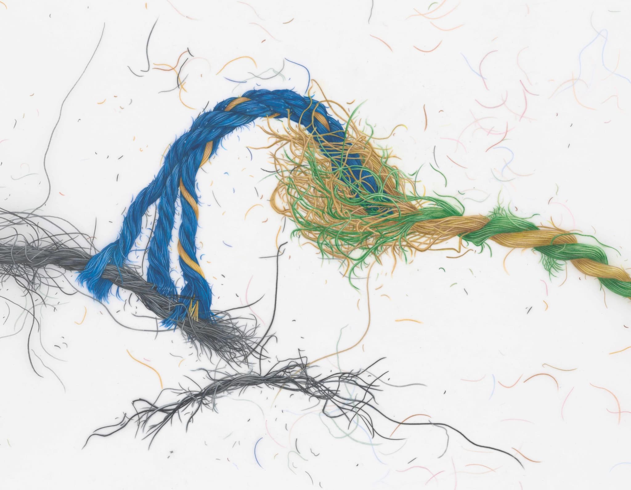 “Attention,” the poet Mary Oliver wrote, “is the beginning of devotion.” It’s also the starting point for Evelyn Rydz, a multidisciplinary artist whose diverse creative practice—which includes drawing, photography, site-responsive installations, and participatory community projects that bring people together in person and online—is grounded by a commitment to close attention as a form of care and a means for connection. It’s evident in everything from her unique dinner parties, designed to foster deep listening and meaningful conversation, to her field studies of coastlines, which often have her peering through jewelers’ glasses and microscopes at manmade detritus that washes ashore. “Water has always been at the core of my interest and curiosity, from childhood all the way to now,” says Rydz, who grew up surrounded by water in Miami—in fact, her very first word was agua. “As a first-generation American with parents who were born in Cuba and Colombia, and grandparents who escaped Poland during World War II, I’m really interested in thinking of water in terms of relocation across coasts and how we’re shaped by those different coastlines and their relationship to home. Water is about distance and separation, but it’s also the thing that connects different places.” Rydz experienced her own relocation in 2002 when she moved to Boston to earn her MFA at the School of the Museum of Fine Arts. Right away, she missed the omnipresence of the ocean she’d felt keenly in Florida. “Even though we’re on the coast here, it’s so different,” Rydz says. “So I started trying to build a new relationship to a different body of water.” She began taking long walks on New England coastlines, from Boston-area beaches to the rocky shores of Maine, and noticing debris spit out by the surf. She observed how an object like an orange bottle cap might become camouflaged in its new context, almost resembling a piece of coral after years of being sculpted by the waves. “My curiosity slowly crystallized into concern,” Rydz explains. “I became really interested in these cycles. What was washing up so often was plastic, and its long history could be traced to an ancient zooplankton dying, going to the depths of the ocean, and then becoming fossil fuel and being molded and shaped into plastic toys and tools to use on land, which often end up as fragments of debris back in the ocean and could cycle in currents for three or four years, then wash ashore on coasts all over the globe.” These mass-produced, quickly discarded commodities are exposed and transformed by Rydz’s careful observation and painstaking handcraft—slow, intentional processes that subvert rapid cycles of capitalist consumption. The resulting works make microscopic processes visible and big concepts easier to fathom. In her Unraveling series, for instance, colored-pencil drawings of frayed marine ropes render individual synthetic fibers in photorealistic detail, while the ongoing project Coastline has Rydz splicing such rope fragments together into a single horizon line. “My goal,” she says, “is to make 372 of them across different panels to represent the estimated 372,000 miles of global coastline.”