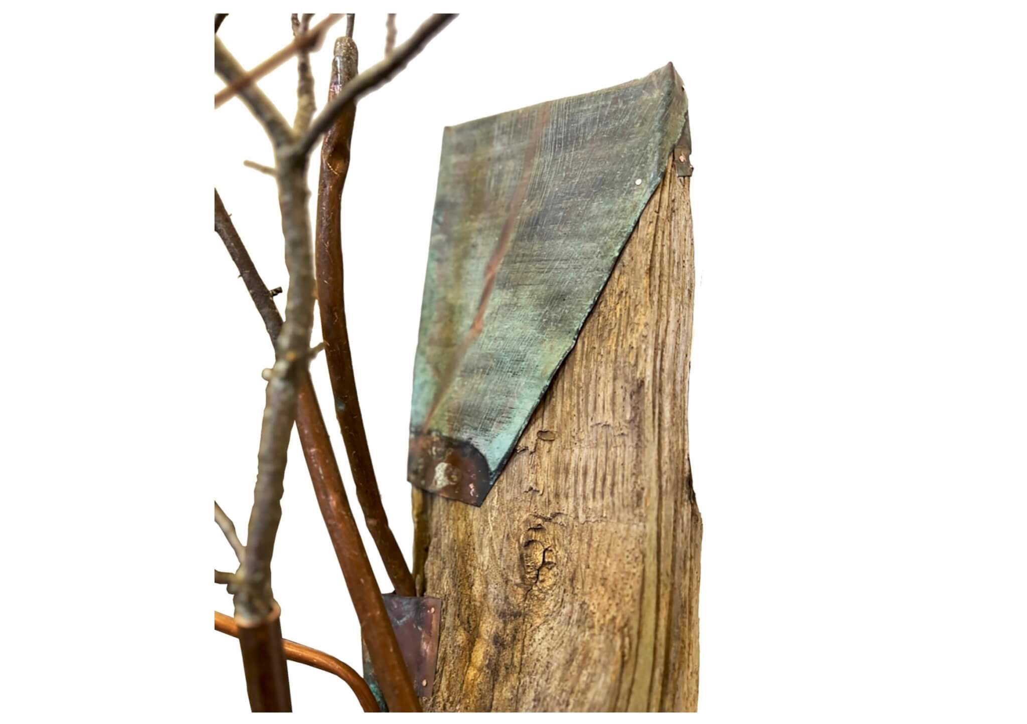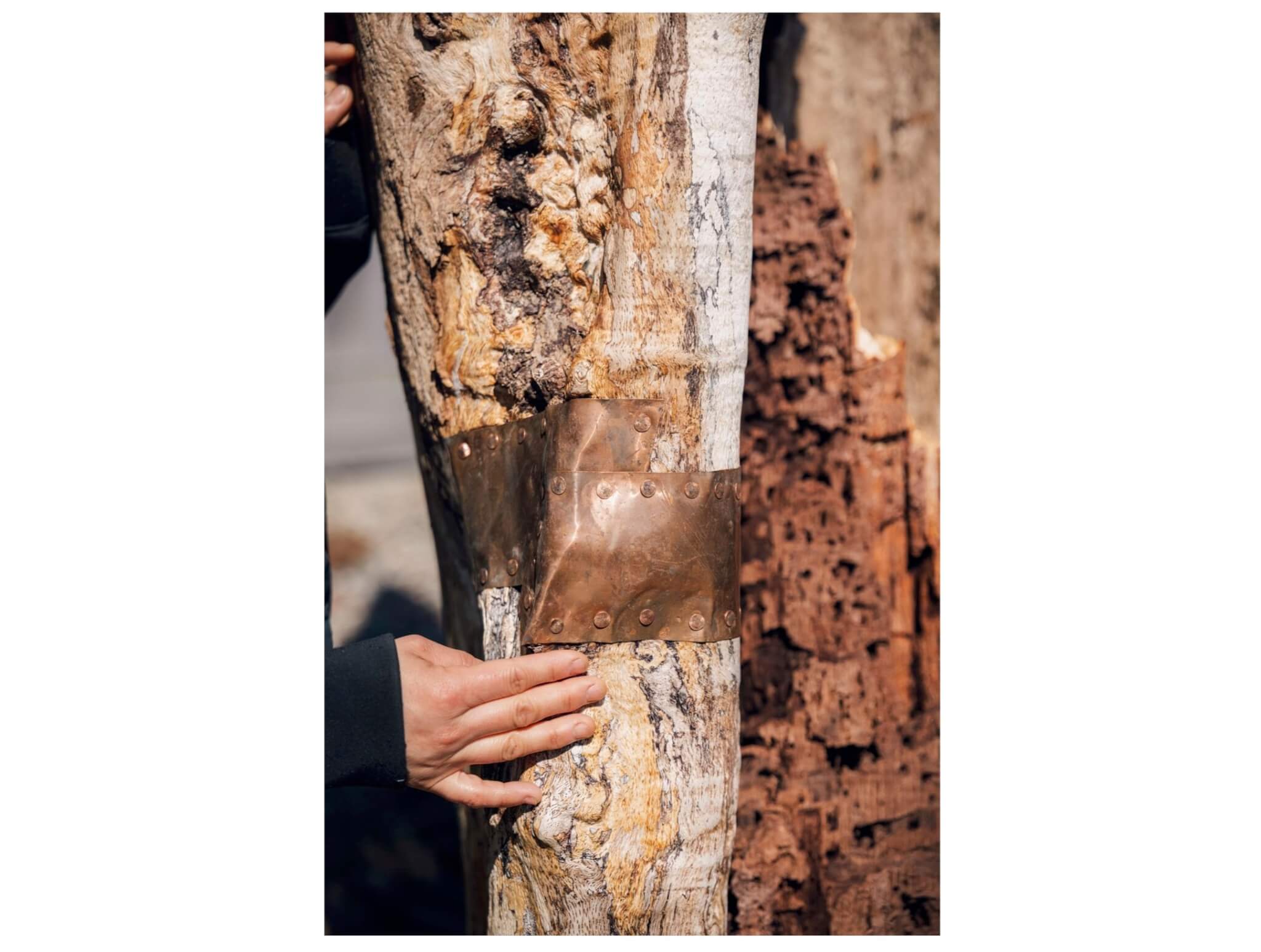 Shin is using salvaged copper to cover holes in the stumps. Photo by Olivia Moon Photography for Boston Art Review.