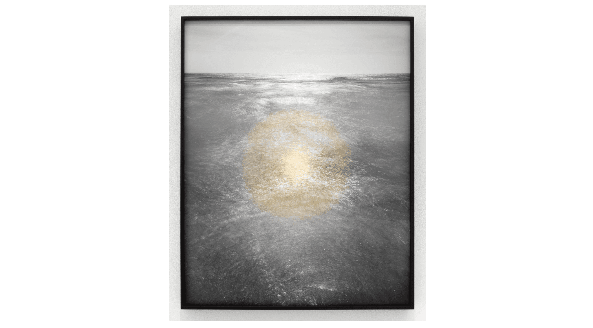 A dark photograph, hanging against a white wall, by Kate Greene features a shimmering display of light.