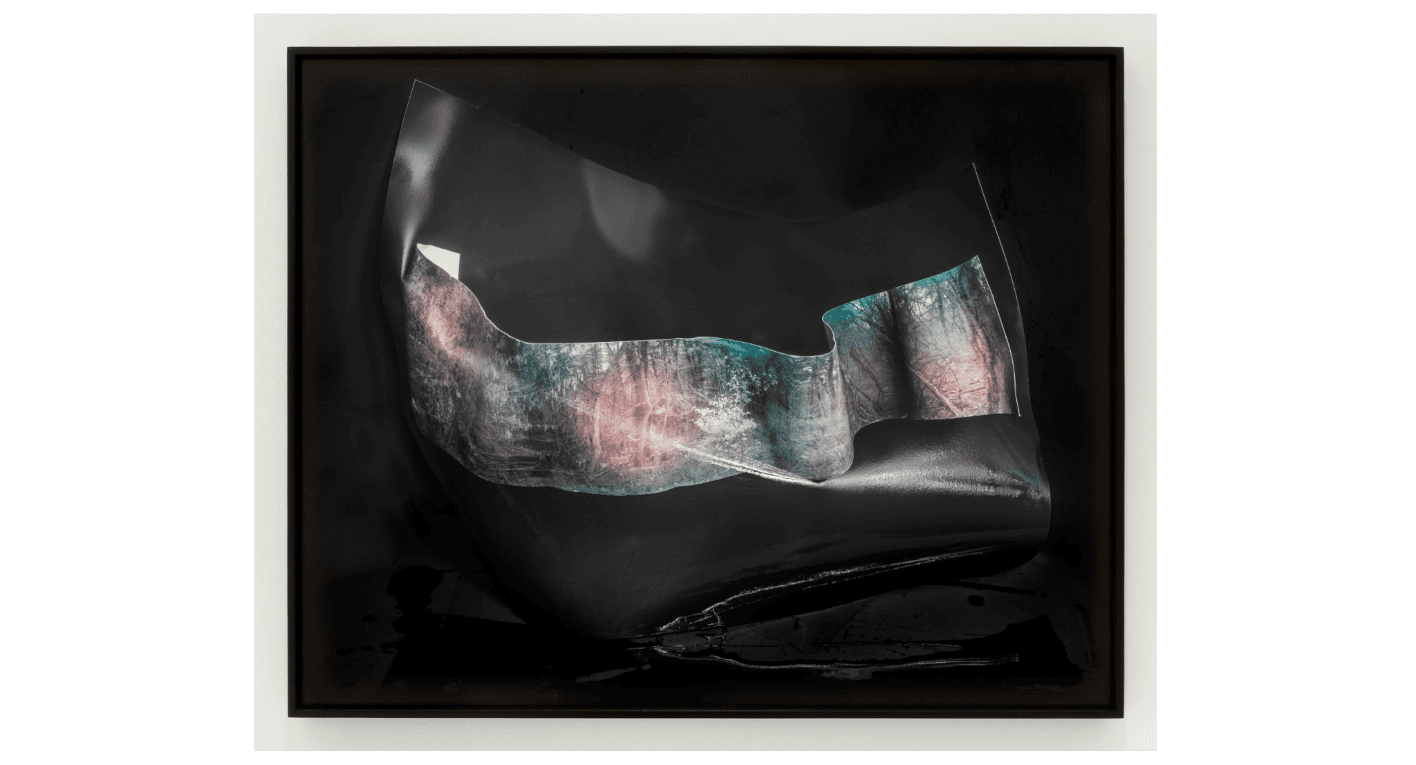 The pale glitter of the Grand Isle photos gives way to an equally seductive, equally infernal blackness in the next body of work—palimpsestic photographs of photographs of photographs, the first two layers of which have been soaked in water, becoming sculpturally distorted. Within this distortion, however, they retain an unnerving level of clarity. Imagery of a forest is apparent, the hand-tinted appearance of its smoky rainbow colors an artifact of the infrared process rather than a painterly judgment. The burnt, drowned, disrupted, darkly glamorous narratives built by these photographs have a palpably occult sensibility. This supernatural atmosphere is traceable to not only the ritualistic manner in which Greene soaked the photographs before rephotographing them, but also to the fact that the depicted forest—the Freetown-Fall River State Forest in Massachusetts—is said to be the “most haunted forest in the United States” and has been the site of documented turmoil from the colonization of the Wampanoag land onwards. Forest study no. 2 (Freetown-Fall River, Ma) invites the viewer into the same embracing freefall offered by the Grand Isle photos.