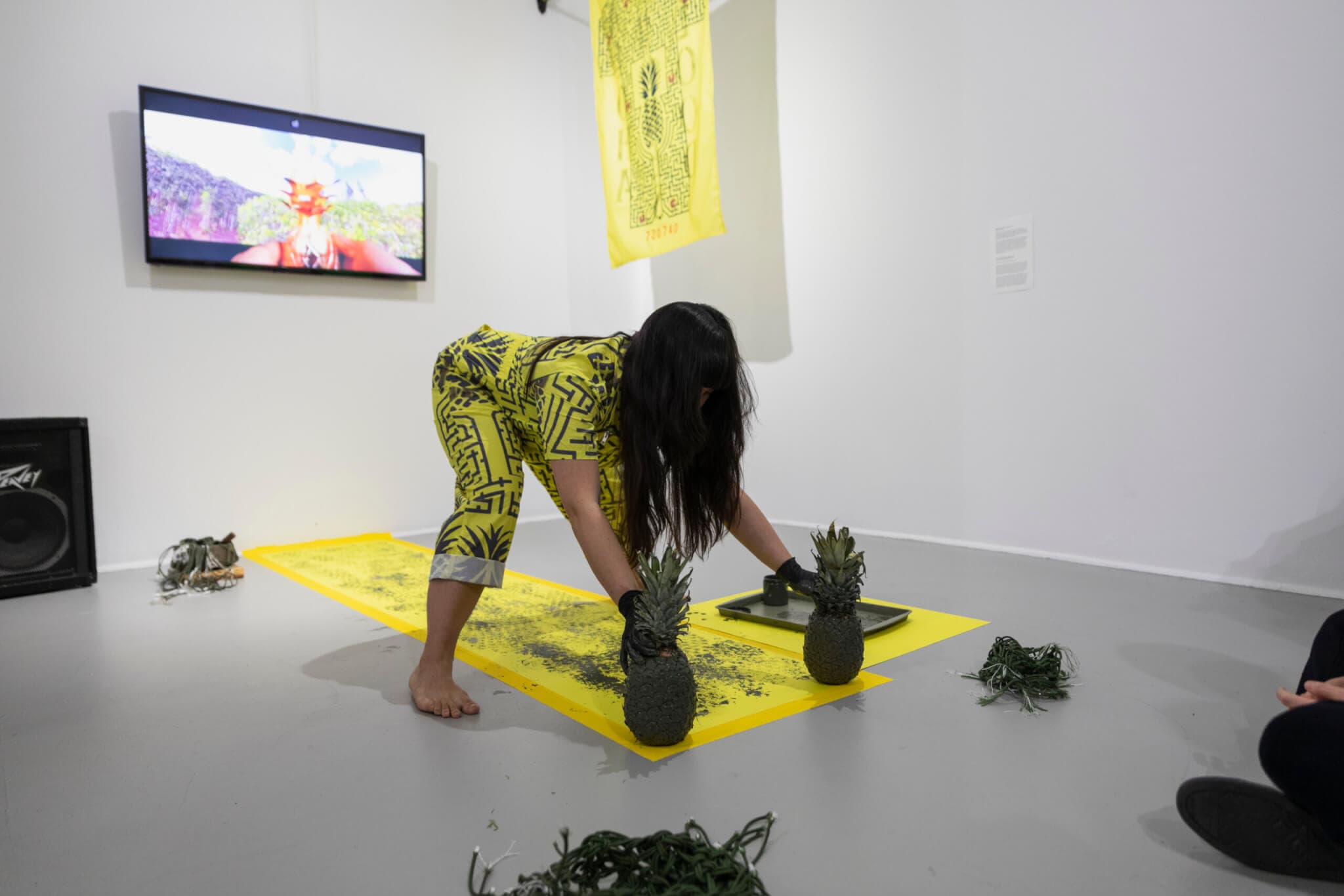 Born in the Bay Area in California and raised in Tennessee, Oahu, Hawai’i, and Okinawa, Japan, Asunción moved to Boston in 2017, several years after earning an MFA in art from the University of Connecticut. Blocks away from Asunción’s studio and living space in Jamaica Plain, the Hardcore House on Green Street, they discovered the Dole House, the historic home of James Drummond Dole, founder of Dole Food Company. The company’s logo is so ubiquitous that it is almost invisible. I see this logo every time I shop for food and open the pantry and refrigerator: cans of tropical fruit, bunches of bananas, frozen produce, and juice. Asunción reminds us of Dole’s impact on the land and the people who labored on its plantations. In their performances and installations,