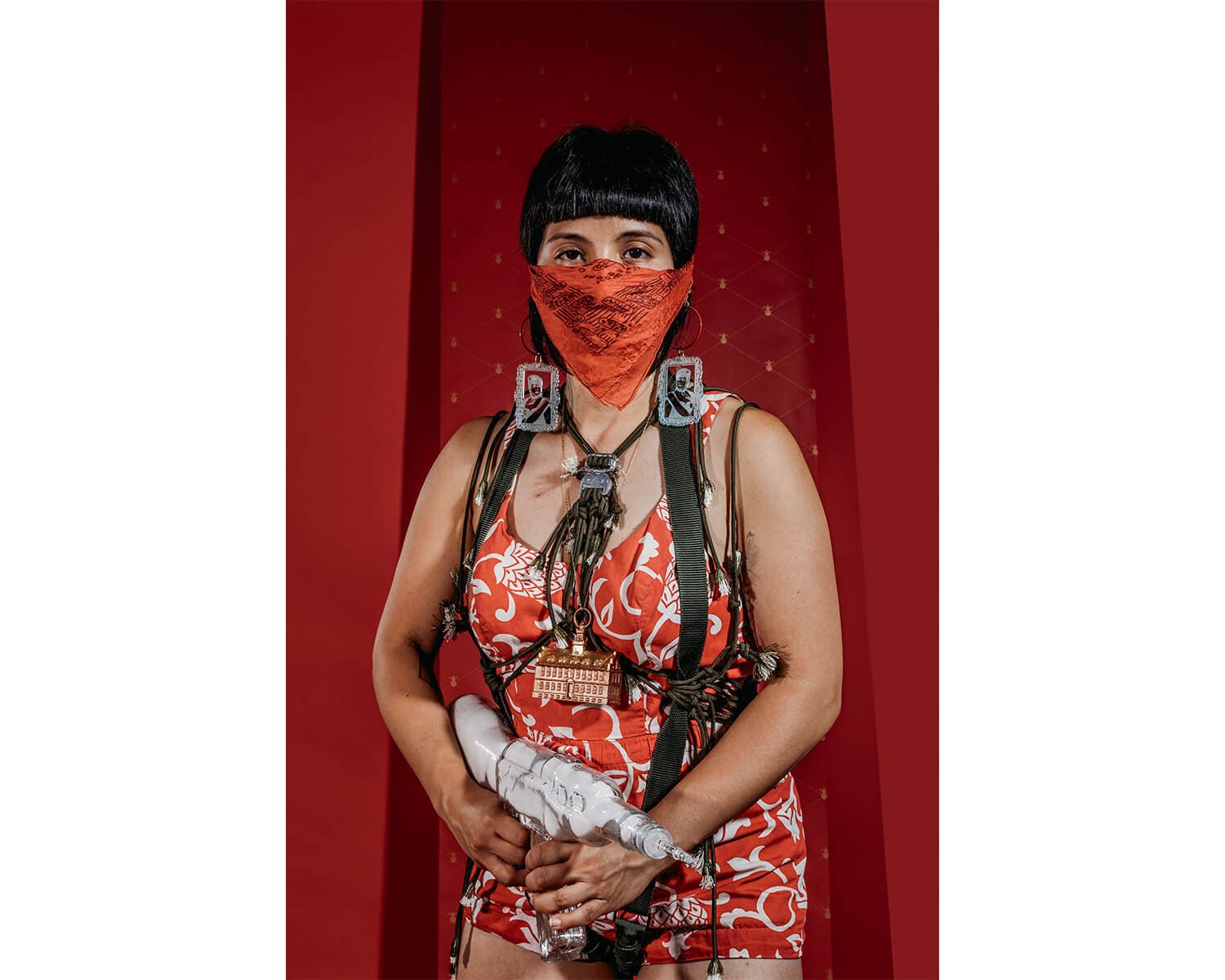 In Big Luau Give Back Aloha (2021), Asunción stares at the viewer while pointing a glass gun filled with white crystals of tubó, Filipino for sugarcane, and wearing an orange vintage bathing suit and a necklace heavy with a 3D-printed pendant of the Old State House. And in Dole House (Self Portrait) (2021), they meet the viewer’s eyes through the reflection in a mirror. Here Asunción is dressed in a barong tagalog, a translucent top tailored with both a man’s sharp collar and a woman’s terno, the butterfly sleeves that former First Lady of the Philippines Imelda Marcos popularized during the twenty-year reign of her husband, President Ferdinand Marcos. Imelda wore dresses with these iconic puffy sleeves for state events, posing for photos next to the company she and her husband kept, including world leaders such as Muammar Gaddafi, Saddam Hussein, and Fidel Castro. Asunción’s self-portrait layers butterfly sleeves and military equipment to visually marry as well as criticize the reverberations of empire in the Philippines.