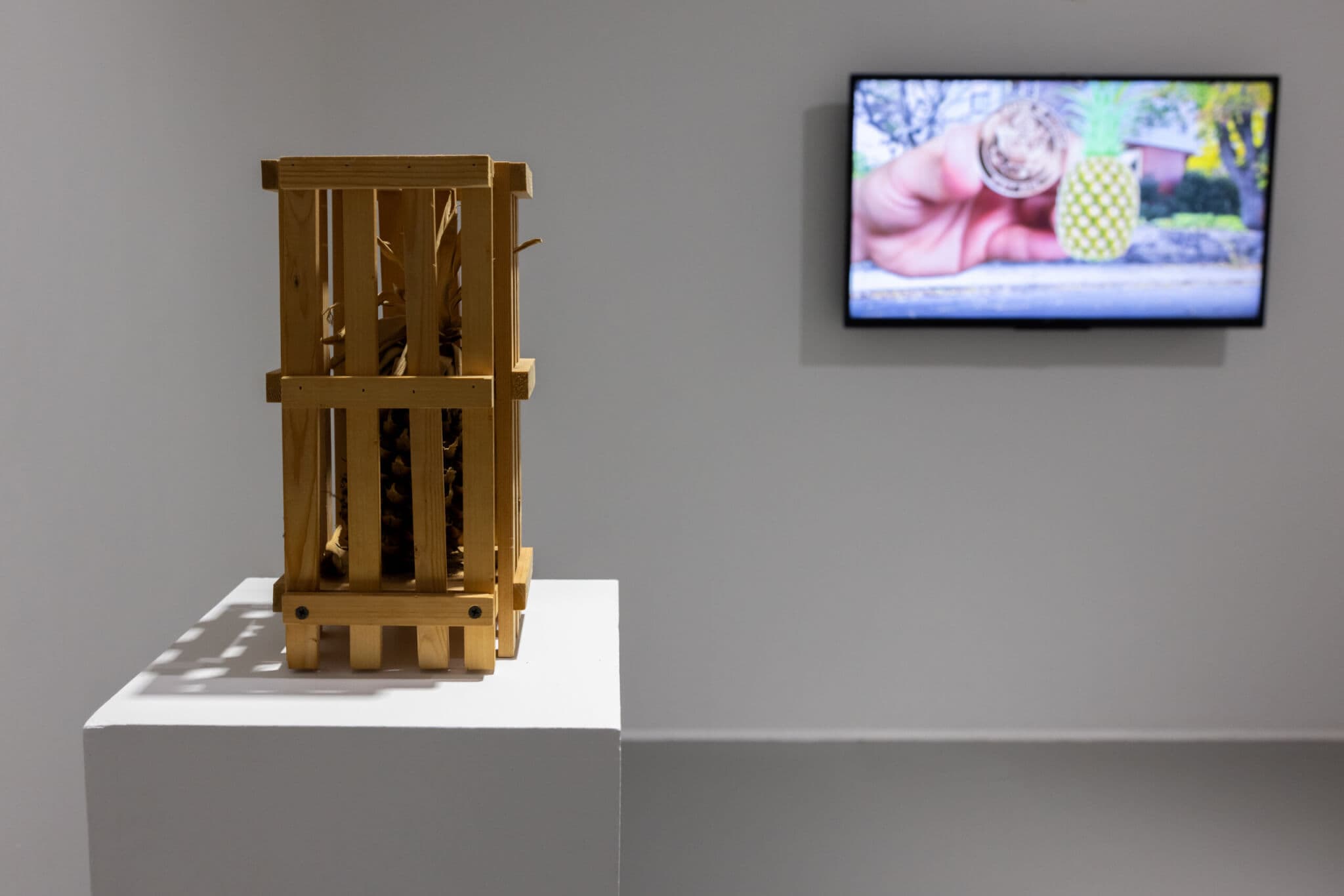 (front) Lani Asunción, The Local, 2010–2024. Fourteen-year petrified pineapple, wood. (back) Dole House performance and Augmented Reality Public Intervention, 2022. Installation view, “Duty-Free Paradise,” curated by J.R. Uretsky at Mills Gallery, Boston Center for the Arts, 2024. Photo by Melissa Blackall.
