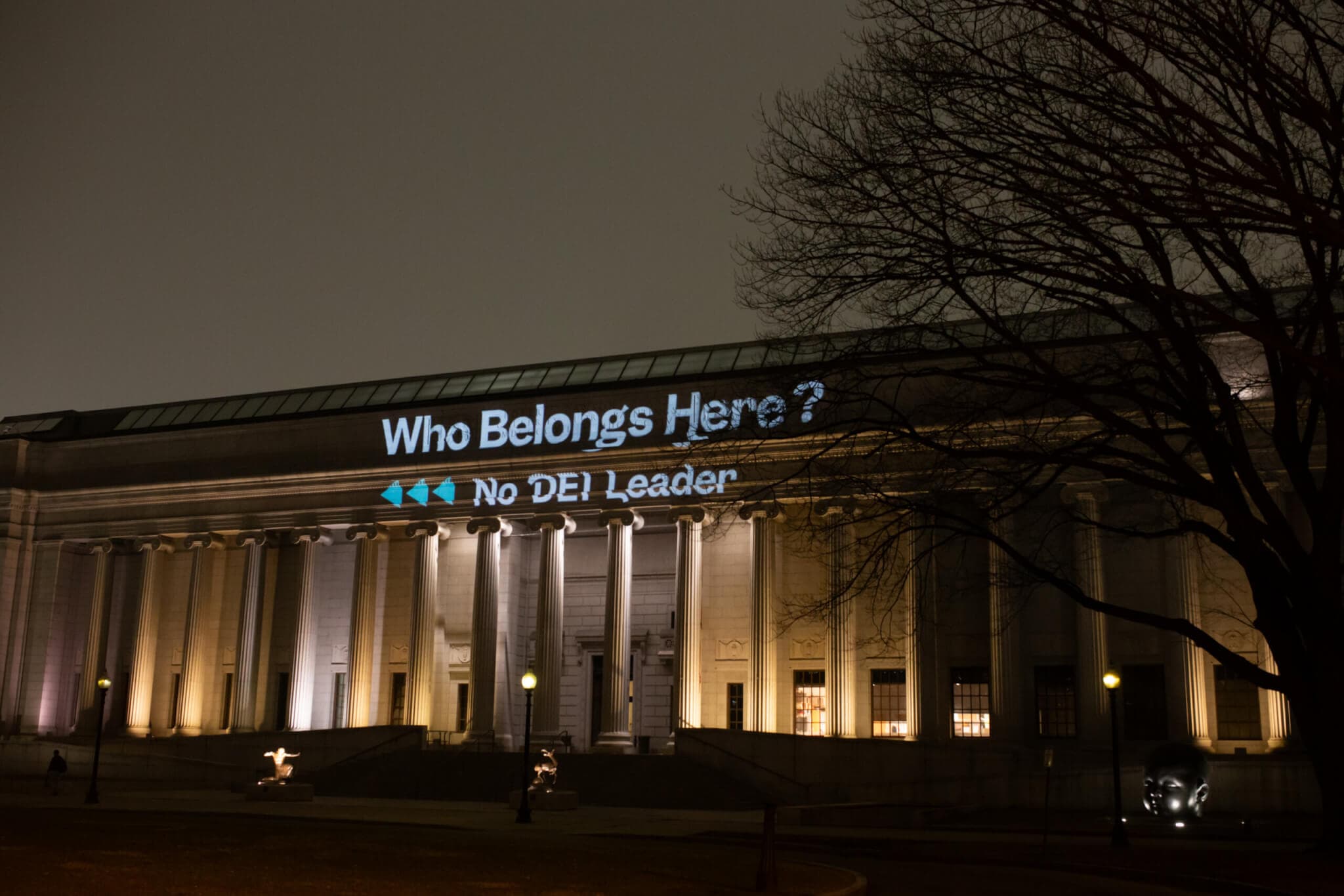 On the evening of March 31, a group of roughly ten anonymous cultural workers projected a five-minute protest video of looped messages onto the Fenway façade of the Museum of Fine Arts (MFA), Boston. The anonymous calls, written in the institution’s own branded font, began just after 9:00 p.m. with questions playing on the museum’s branded tagline from its 2022 rebrand: “Here All Belong?” and “Who Belongs Here?” before answering the question with stark data. “No DEI Leader. No Black Curators. No Muslim Curators. No Arab Curators. No Indigenous Curators.”