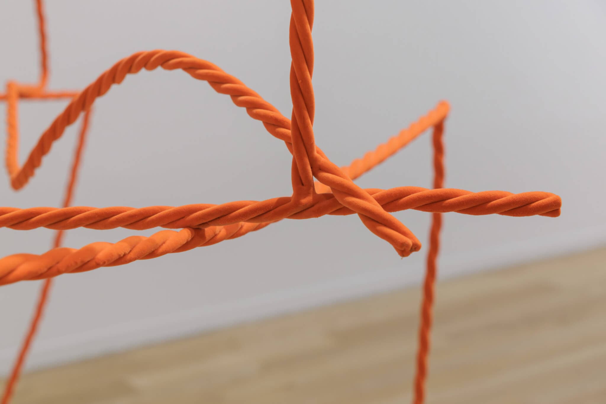 Lopez fashioned Single Line (2023), Safety Dream (2023), and RopeHinge (2025) from many yards of steel coated with nylon flocking to look like rope with a velvety surface. (The third sculpture was co-commissioned by Tufts.) They do not coil neatly or stretch taut between points. Like massively enlarged doodles or trick rope, they have a snake-like quality and a windswept wiggliness, even though they are actually stiff and still. The two L-shaped lengths in RopeHinge bend like legs at the knee. They’re large and suggest infrastructure. One you can walk under. Yet they make the architecture in the room—its doorways, windows, and railing on the way downstairs—look rigid to the point of being uptight. Even though they are sculptures, they feel in some ways like drawings, like fast figure sketches in ink. One could be a person (thin as a rake, skinny as a rope or rail) sitting down on the floor with their legs extended in front of them and their arms up overhead. The other is bent over at the waist, flat back, arms out against their ears, pushing against the wall to try to get a good stretch. The firm rope in RopeHinge thus becomes spinal, the central and shared element of vertebrate architecture.