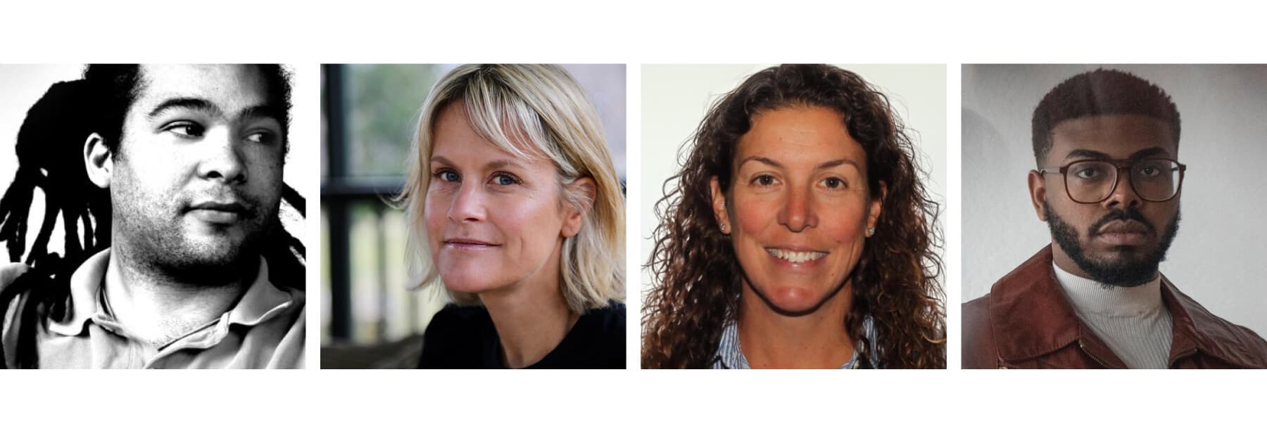 From left to right: A black and white photo of a smiling man with dark hair, a light-skinned blonde woman smiling at the camera, a light-skinned and dark-haired woman smiling at the camera, and a dark-skinned man with glasses and a beard looking at the camera.