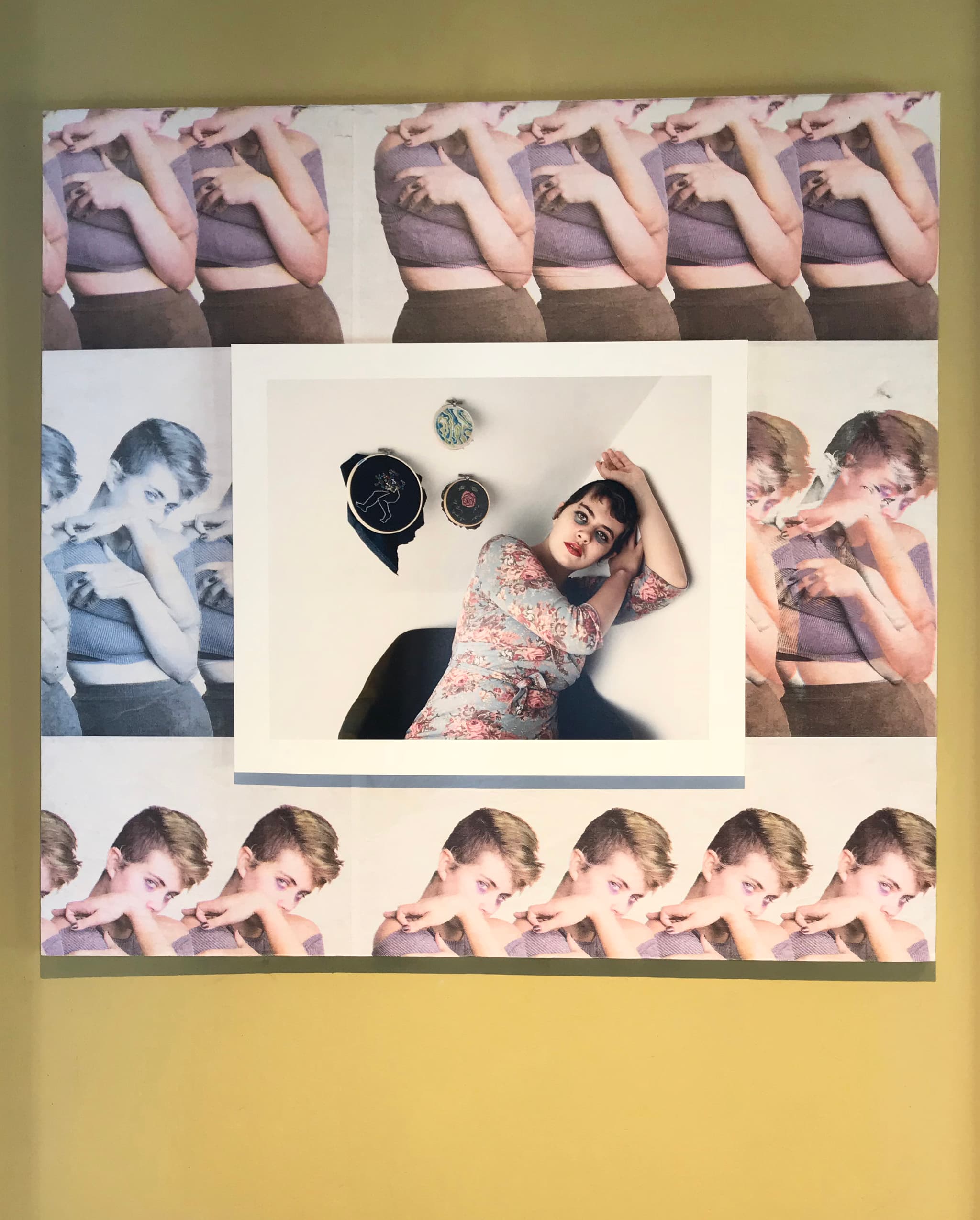 Corbett deliberately places familiar images of the subjects home at the center of each composition to show the individuals in their most unguarded state. In one piece, a model relaxes in bed with a teddy bear, while in another they exhale smoke from a wooden pipe in their kitchen. Framing these vignettes are distorted versions of the models from more formal fashion shoots, which simultaneously provides the viewer with two contrasting perceptions of each model. These distortions vary within each composition. While some pieces feature multiple overlapping versions of the same photo, others take on a filter to make the image resemble scenes off a damaged VHS tape. All the compositions evoke a sense of duality in the models’ presentation – one that is real and one that is artificial.
