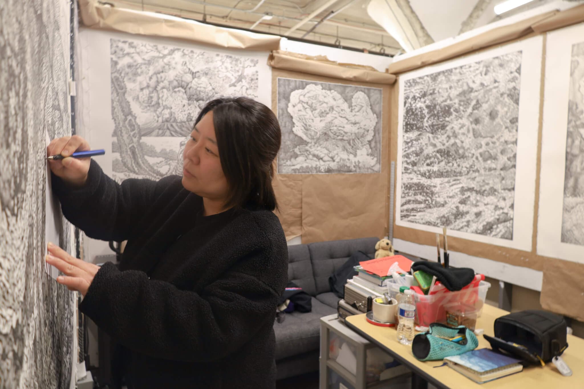 At Tufts University, MiJung Yun is one of approximately eighty SMFA students participating in the Open Studios event. Yun’s large abstract drawings cover the wall space in the orderly, brightly lit studio. Two plushies are curled on the grey couch in the corner, belonging to Yun’s daughter, who frequents the studio. Her daughter appears in a nearby self-portrait; they’re both depicted as tigers (the daughter as the cub, of course). This piece is featured in Yun’s Volcano series, which she began creating using inexpensive ninety-nine-cent pens, often received for free at conferences, which were later swapped for Micron and ink pens for longevity.