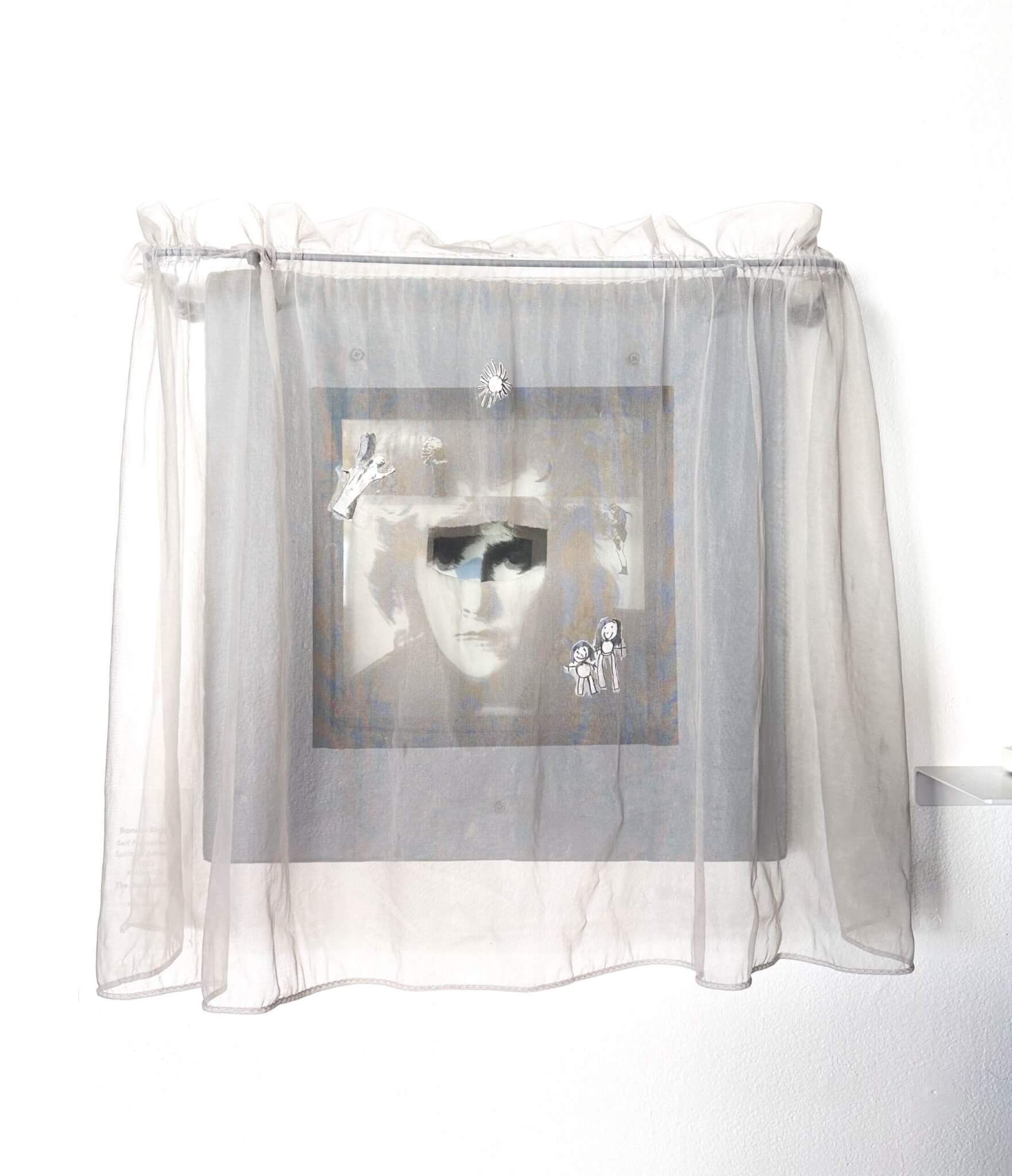 Bonnie Biggs, "Self-Portrait with Spritual Advisors," installation view, 1982. Installation view, group exhibition, "Plastic Image Retrospective: Electrographic Prints, 1979–90," on view at the Boston Cyberarts Gallery through October 26, 2024.