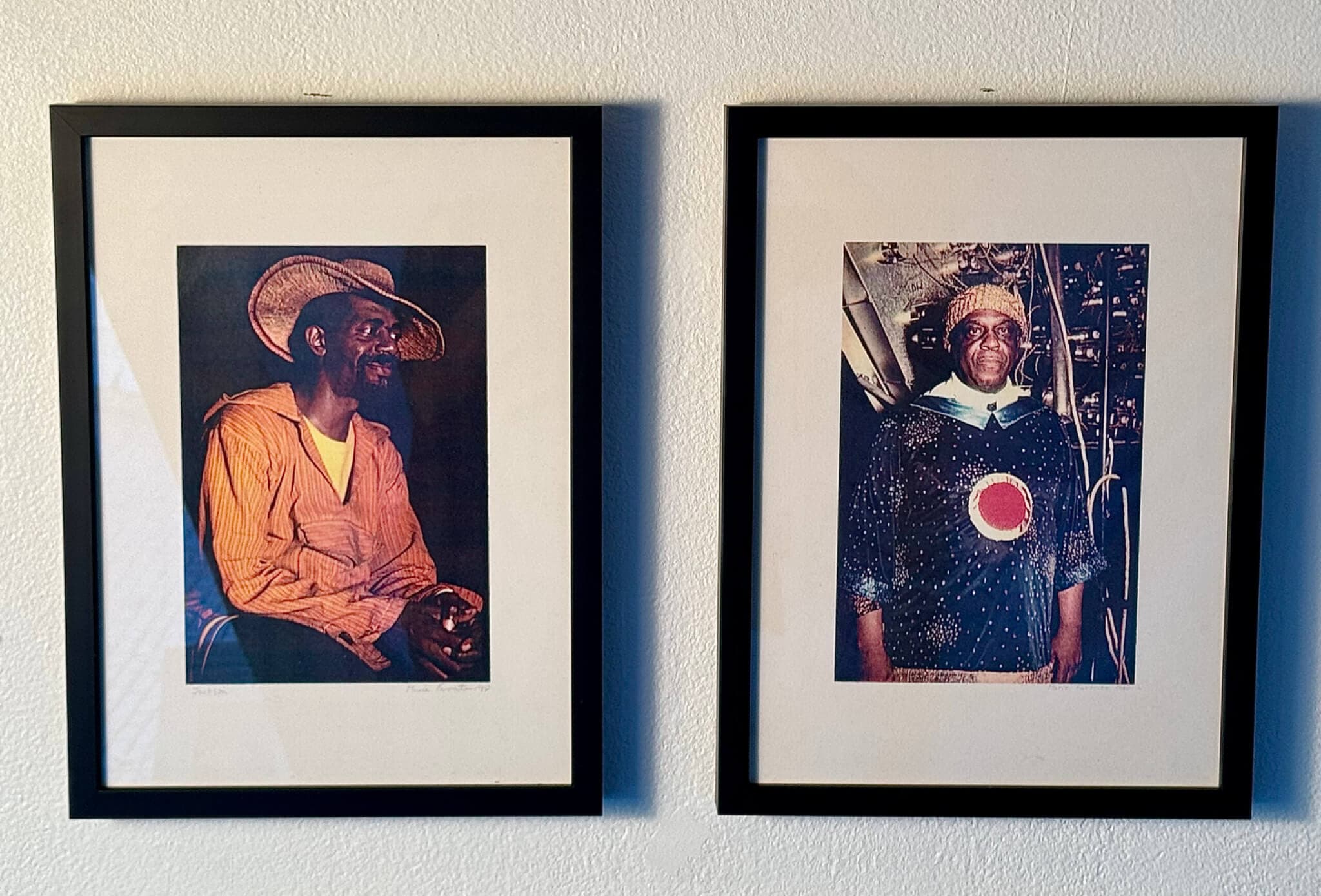 (left) Marie Favorito, Jackson, 1980, Xerox 6500. (right) Marie Favorito, Sun Ra, 1980. Xerox 6500. Installation view, “Plastic Image Retrospective: Electrographic Prints, 1979–90,” on view at the Boston Cyberarts Gallery through October 26, 2024. Photo courtesy of Sherry Edwards.