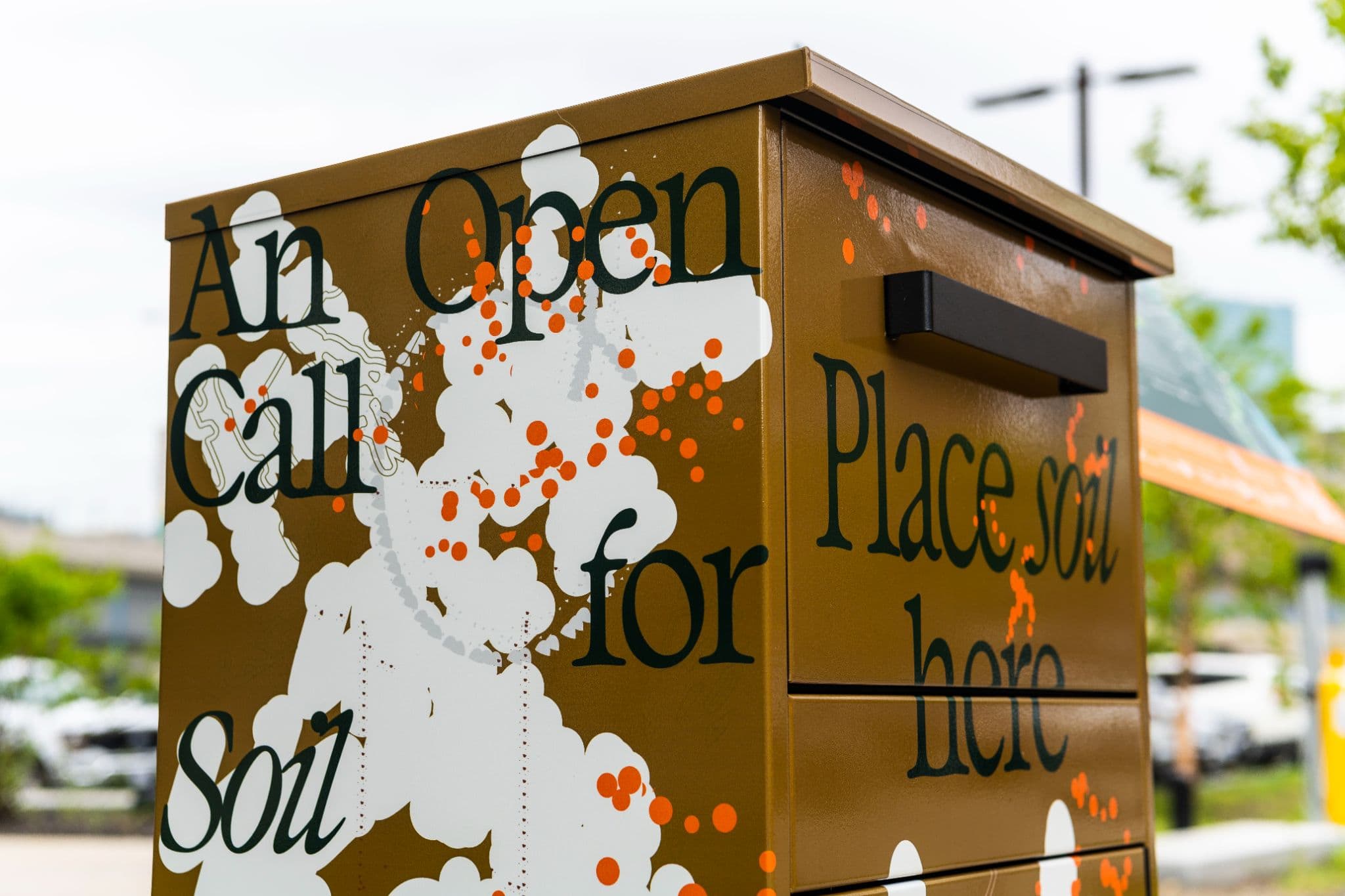 An Open Call for Soil box installed in downtown Boston as part of artist LaRissa Rogers’s upcoming project, Going to Ground, 2024. Photo by Lee-Daniel Tran. Graphic design by Chen Luo. Courtesy of The Rose Kennedy Greenway.