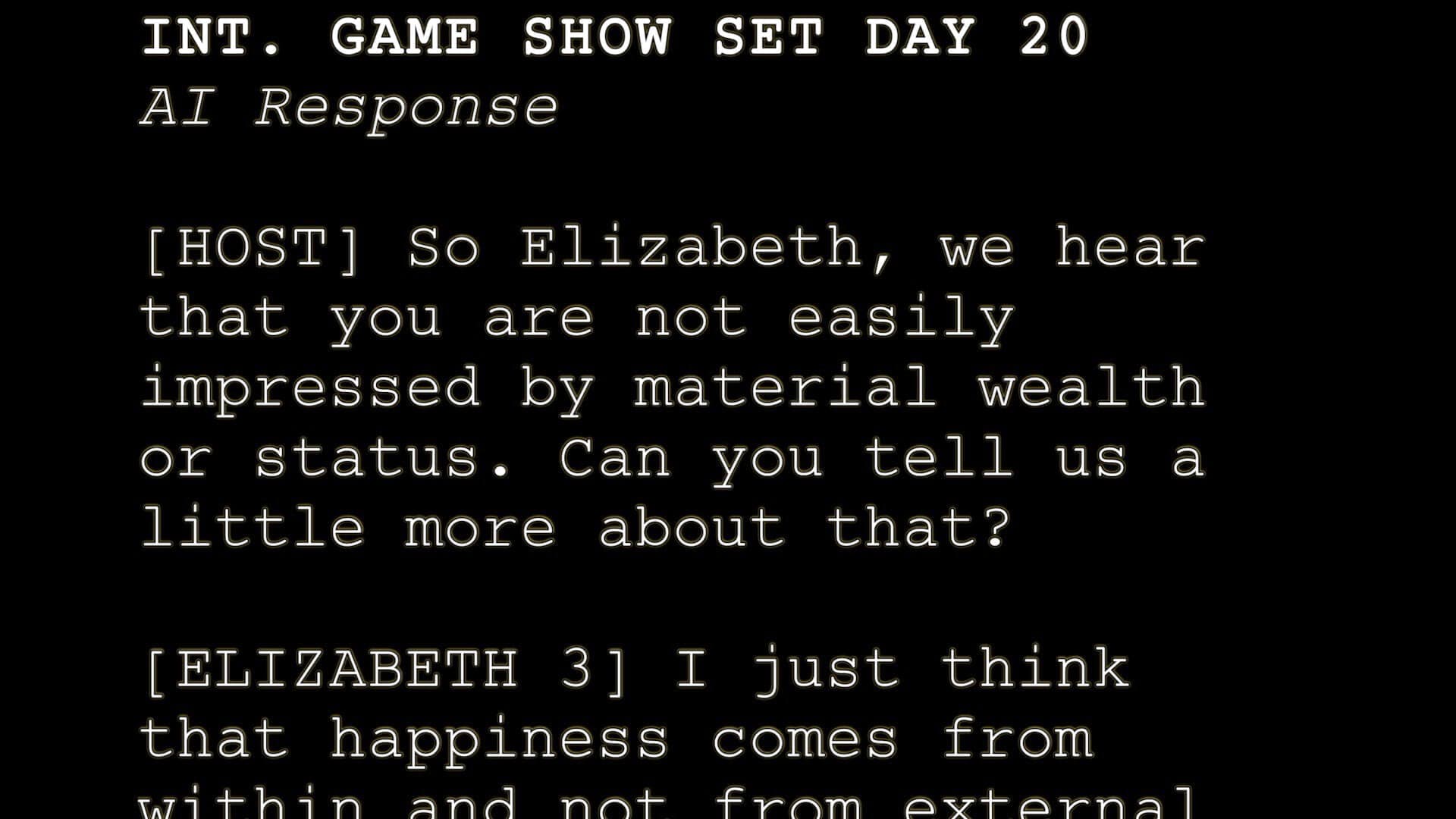 The cumulative effect of this mode of presentation is a piecemeal portrait of Schneider that, despite highlighting the peculiarity of this exchange, presents a compelling portrait of the contestant. Even for avid Jeopardy! viewers, this logical yet uncanny presentation of this segment calls into question the ways in which we present ourselves to the world. At the end, when the work asks the audience, “Who is Amy Schneider?” the viewer gains an understanding of who the contestant is—or at least, what she finds important to convey about herself.