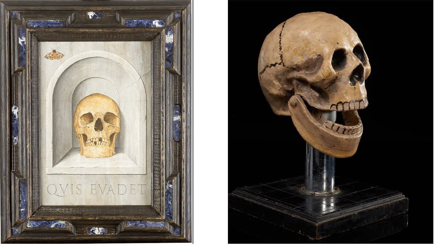 Left: Attributed to Sebastian Stoskopff Quis Evadet [Who will be spared?] ca.1620-1650 Oil on wood | Right: Anonymous “Talking Skull” ( Early 20th century) Painted papier-mâché, wood, and steel
