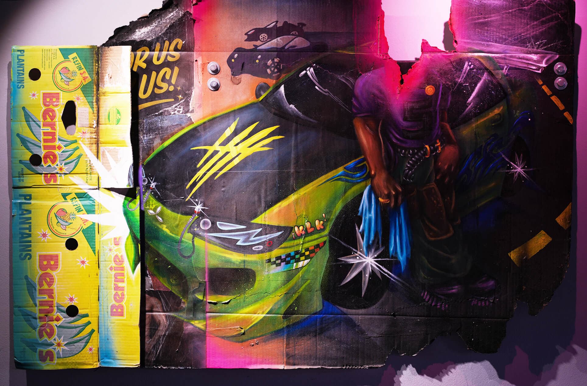The atmosphere of the space pairs well with the tropical color palette of pieces like Too Fast and Too Furious—a painting of a rich-skinned man adorned in gold jewelry and a fly fit leaning against his modded-out lime-green Mitsubishi with sparkling rims (rims we can assume he just finished polishing judging by the cloth in his hand). Written on the car is “¡KLK!”, a Dominican phrase that translates to “Wassup!” This piece is wholly reminiscent of punto, street car meets that happen on late summer nights, where blasting dembow out of chucheros is a form of flexing. The piece is painted on a plátano box, the perfect homage to Dominican culture—a culture that is vibrant, energetic, and flashy. Too Fast and Too Furious is a snapshot of the prevalent nightlife and everything that comes with it—street racing, keeping your possessions in pristine condition, and looking good. Flashy jewelry, cornrowed hair, rich skin, and tattoos—things that serve as identity builders, forms of creative self-expression, and signifiers of social status can become bullseyes on their backs. Those same identity builders can double as a form of confirmation bias to those outside of their circles—a means to perpetuating harmful stereotypes. The men who participate in parading their prized possessions on the freeway may also be reduced to being troublemakers—easily identified by the glamour and swag that they carry.