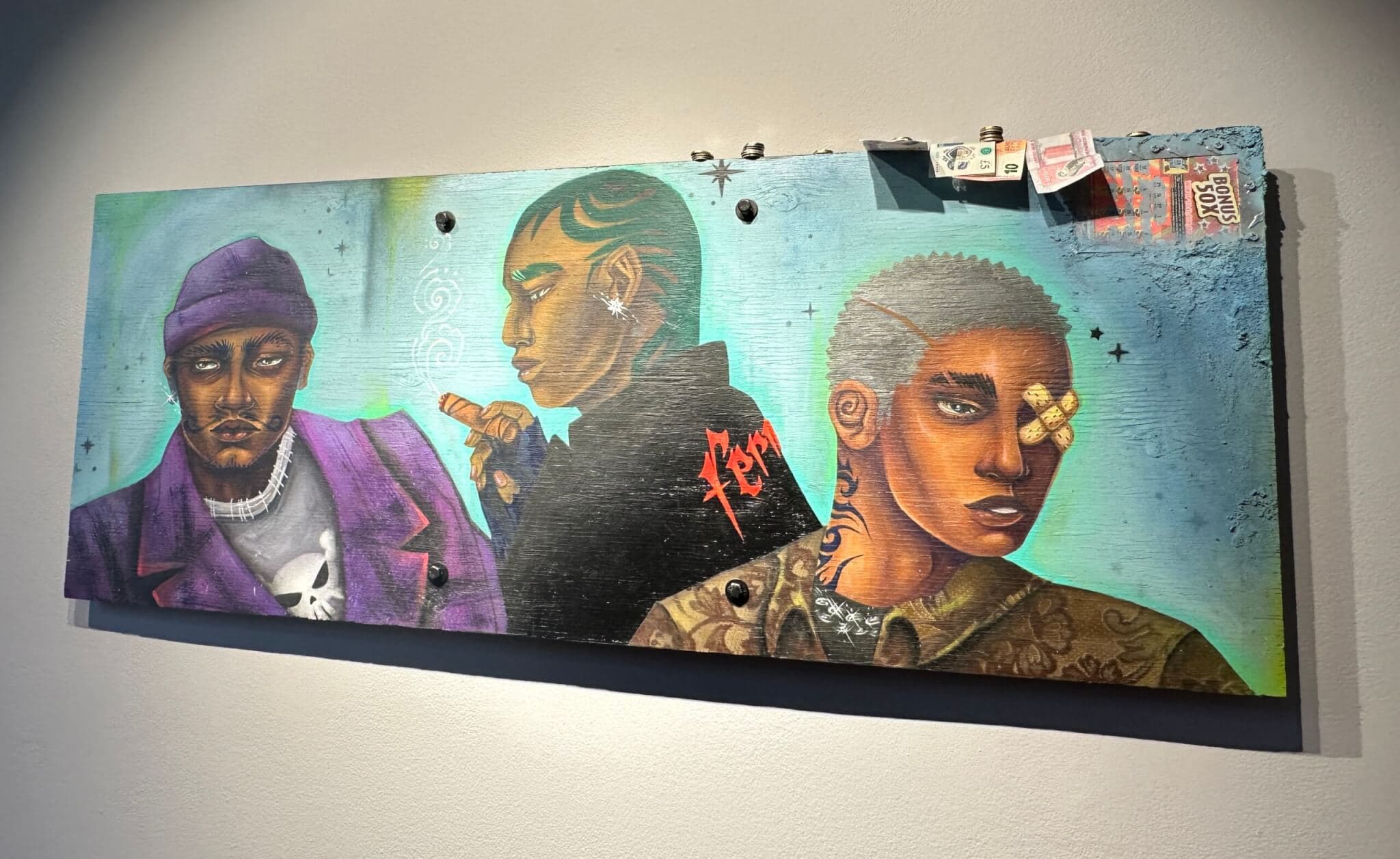 Them Rowdyruff Boyz paints a trinity of clean, fashionable, handsome men who, despite their glamour, have a roughness to them—perhaps a callused exterior built from being exposed to harshness. As if embedded into the world in which they exist, dollar bills and scratch tickets adorn the top right of the long wooden panel upon which the painting is depicted, suggesting the scars they’ve accumulated along the way have been in pursuit of having money in their pockets—a necessity for survival. Survival is the name of the game for those of us who’ve been subjected to the harshness of a world that opposes your existence, but as in Tupac’s poem The Rose That Grew from Concrete, we see that despite lacking necessities in life, there is still a chance for growth, beauty, and prosperity. Rixy’s illustrations of the reality of urban existence capture the nuances of having to fight to survive, and thrive, by any means—regardless of whether we’re sprouting from soil or from concrete.