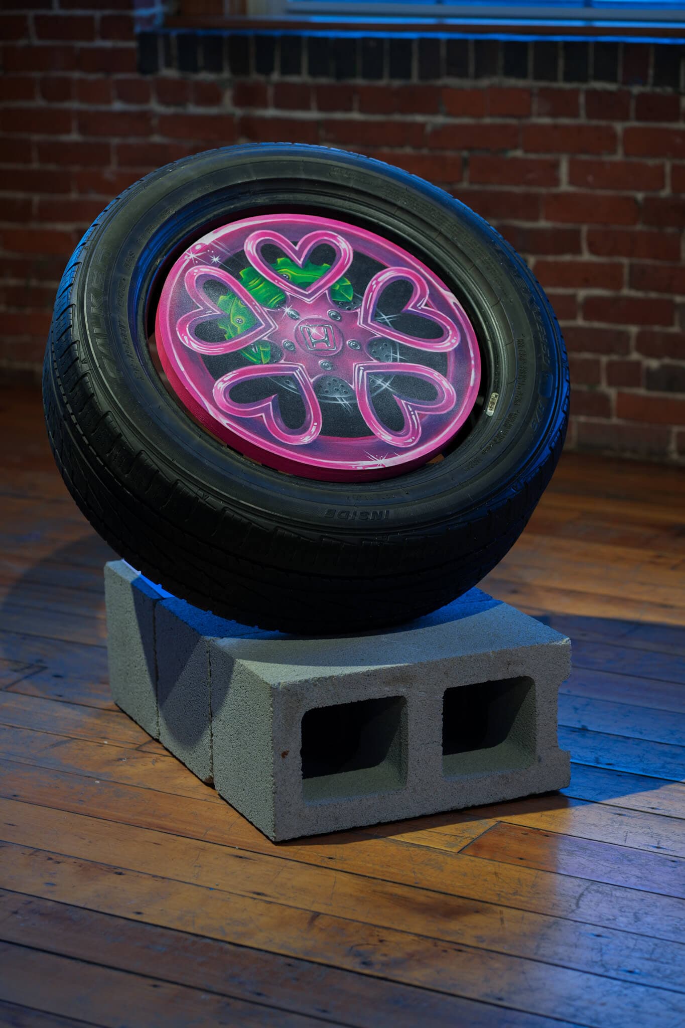 Rixy, "Off We Go," detail, 2024. Acrylic and spray paint on wood mounted on a tire. Courtesy of Essex Art Center.