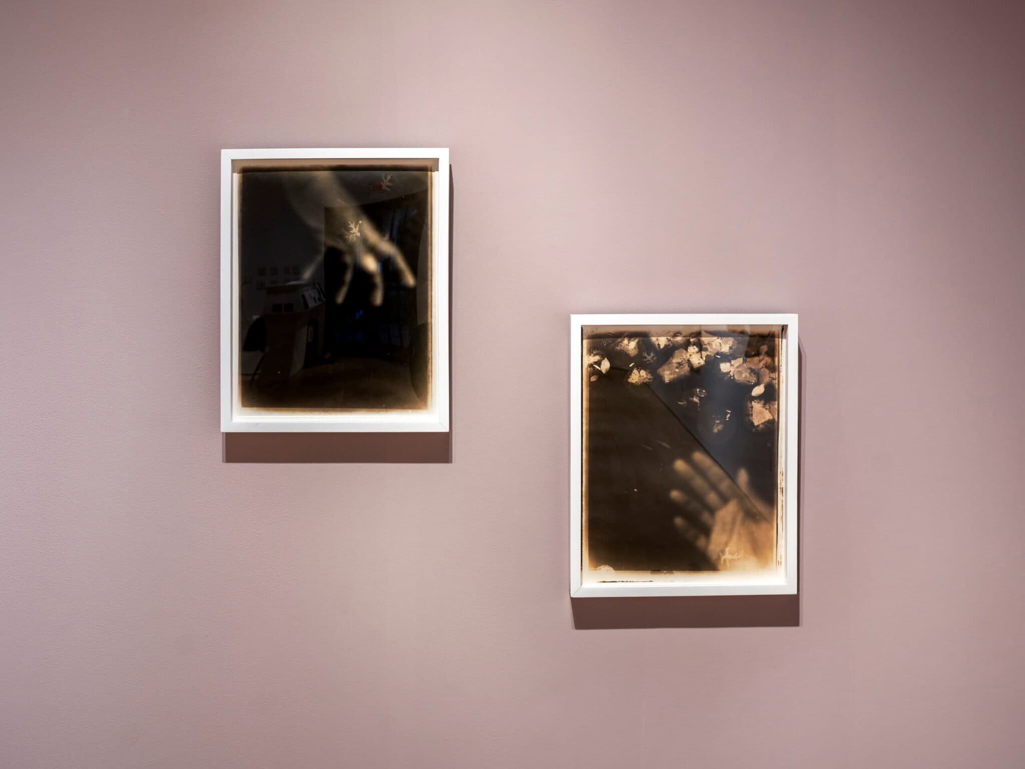 Felicia Megginson, (left) Permutation—Reach and (right) Permutation—Release, both 2002. Sepia and selenium toned gelatin silver prints from the series Alice Wasn’t Lost, She… Installation view, “Re-Framing Nature,” Providence College Galleries, Providence, RI, 2026. Photo by Scott Alario. Courtesy of Providence College Galleries.