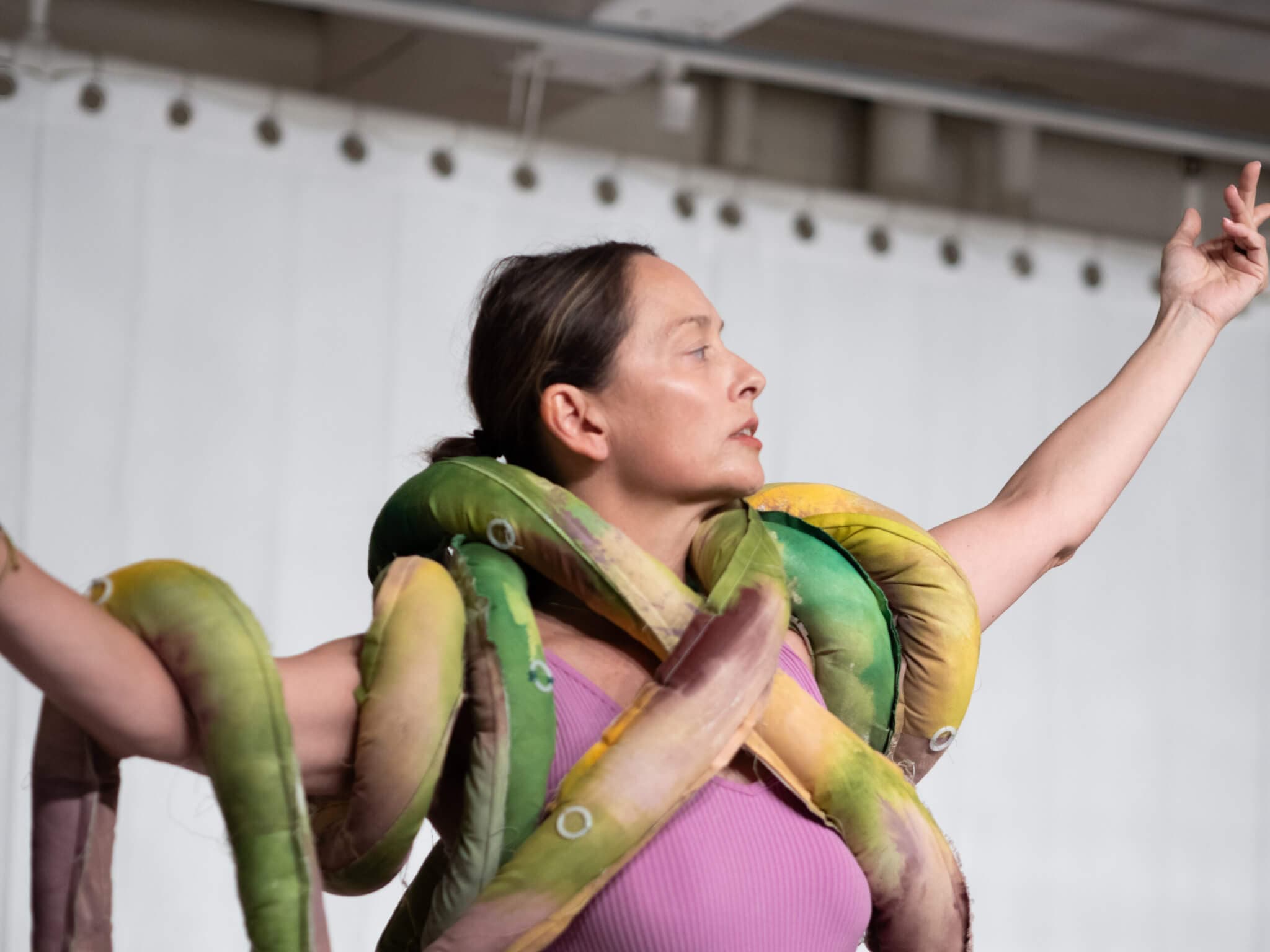 What followed were several other compelling and at-times-awkward encounters, made more intimate by virtue of the small venue. In Loose, Laila J. Franklin propelled herself across the stage in a graceful and captivating dance. Kledia Spiro painstakingly walked on all fours for her piece Te dua aq shumë: I love you so much, ripping excerpts of her father’s love poems off of a hand-fashioned belt and handing them to the audience. In the cramped room, audience members had to scoot forward and backward to make way for Spiro. She then called upon everyone to read their lines aloud, first one at a time and then all together. The result was a jumble of utterances, a verbal exquisite corpse, voices timid and bold and everything in between. Deeply collaborative and playful, it felt like a conversation with a good friend, a religious ritual, a rite of passage all at once.