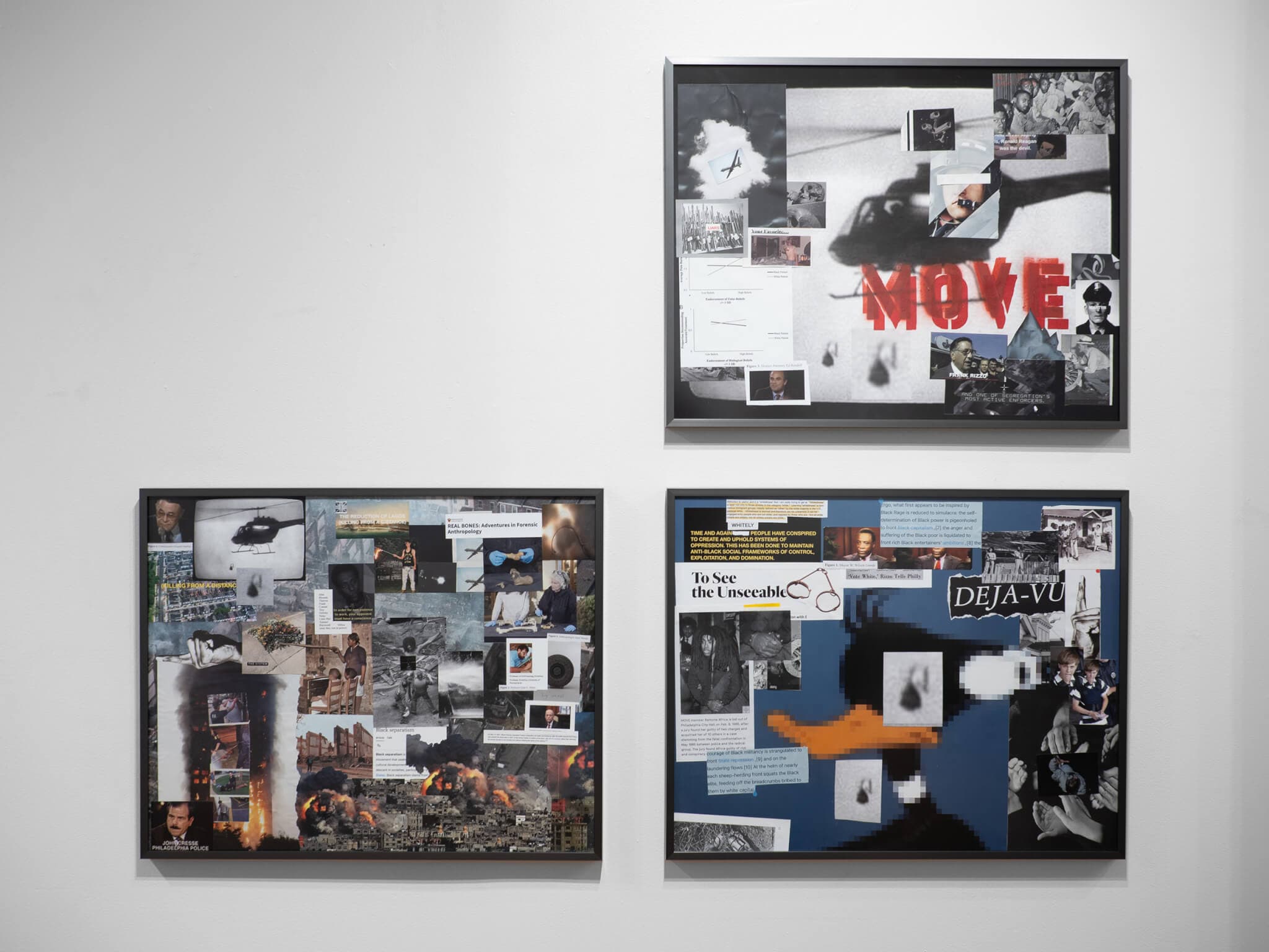 Zora J Murff, The Devil Hiding in Plain Sight, installation view, 2024. Set of three framed mixed-media collages. 20 x 25 inches each. Courtesy of Abakus Projects.